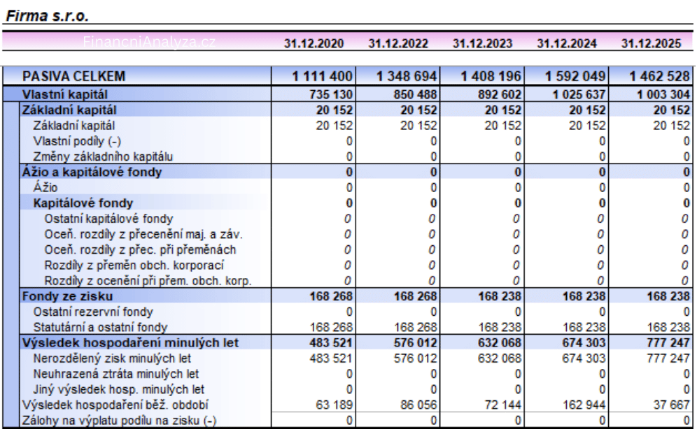 - Výřez z výkazu pasiv zobrazující strukturu vlastního kapitálu – základní kapitál, fondy ze zisku a nerozdělený zisk minulých let. Slouží jako podklad pro hodnocení, jakou část aktiv firma financuje z vlastních zdrojů.