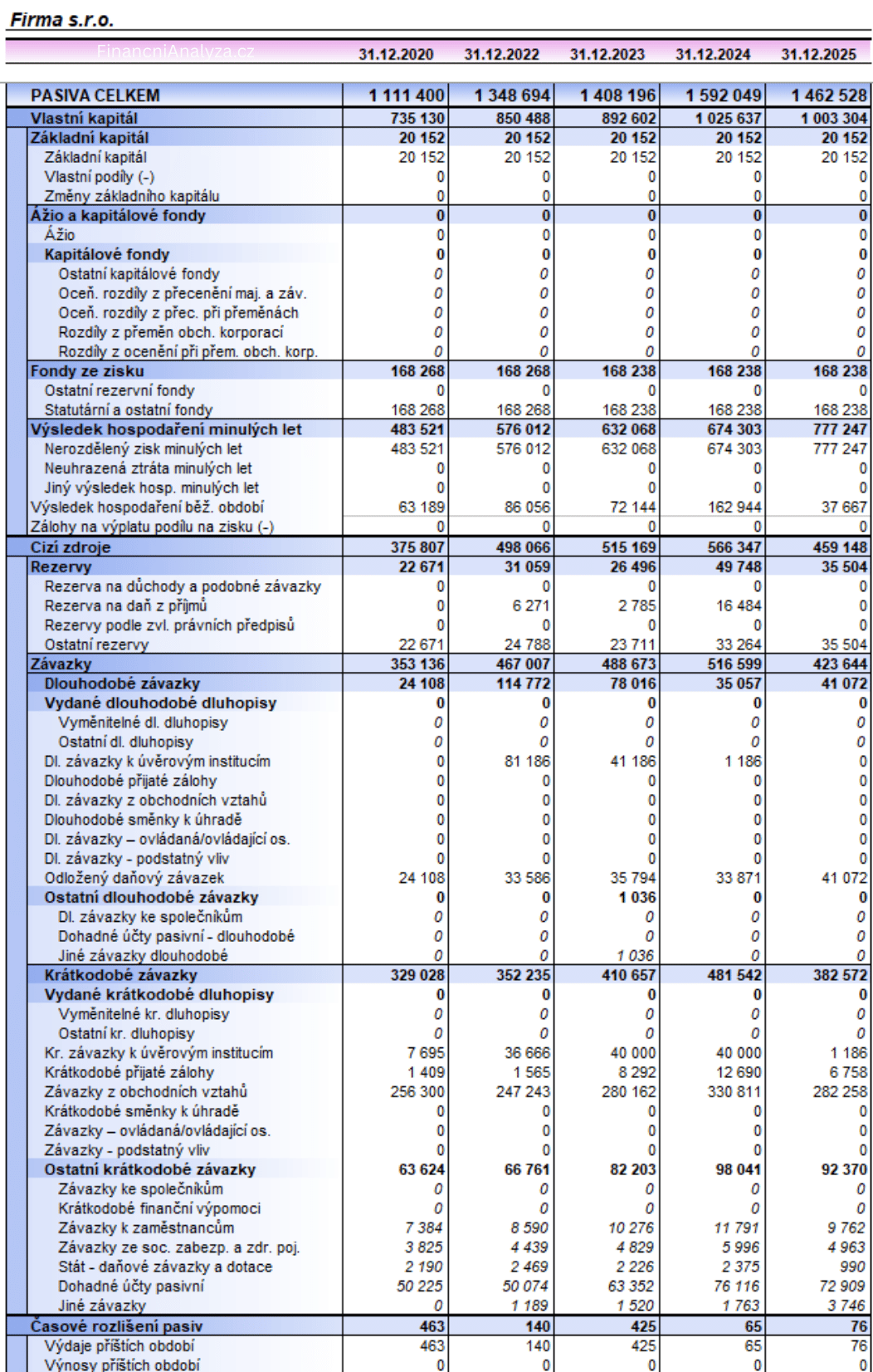 Obrázek zobrazuje celkovou strukturu pasiv firmy, tedy zdroje financování aktiv. Je zde vidět rozdělení na vlastní kapitál a cizí zdroje a jejich vývoj v čase.