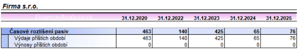 - Obrázek zobrazuje výdaje a výnosy příštích období, tedy pasivní časové rozlišení. Tyto položky neznamenají klasický dluh, ale časový posun mezi účtováním a skutečným peněžním tokem.