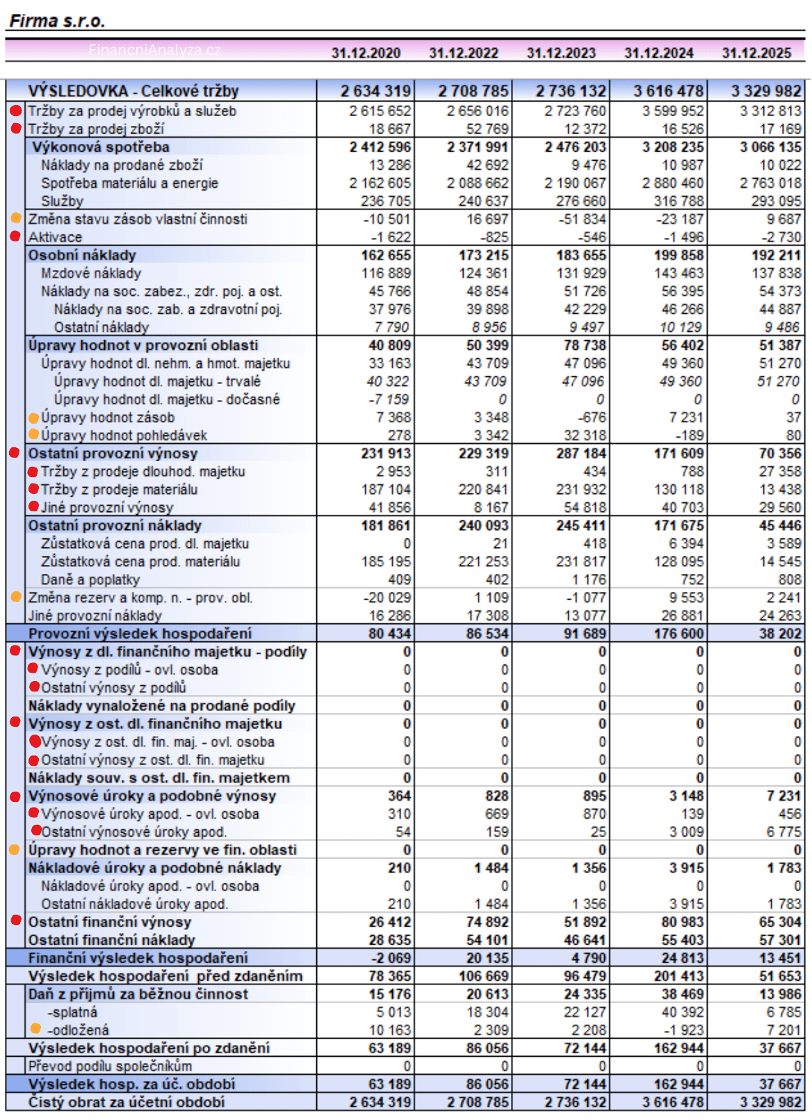 Na obrázku výše je uvedena vzorová výsledovka reálné výrobní firmy, která vykazuje výkazy za 5 období.