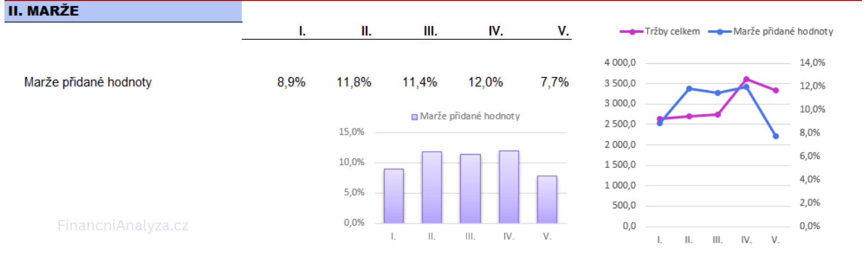 Proto je marže přidané hodnoty velmi citlivým ukazatelem změn v obchodním i provozním modelu firmy.