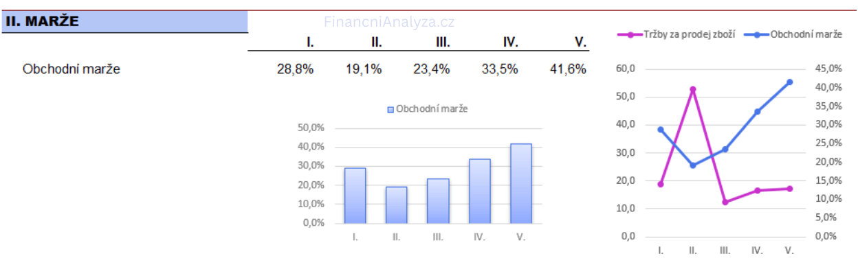 Sloupcový graf vlevo zobrazuje vývoj obchodní marže, která kolísá, ale v posledních obdobích výrazně roste (z cca 19 % až na více než 40 %).
