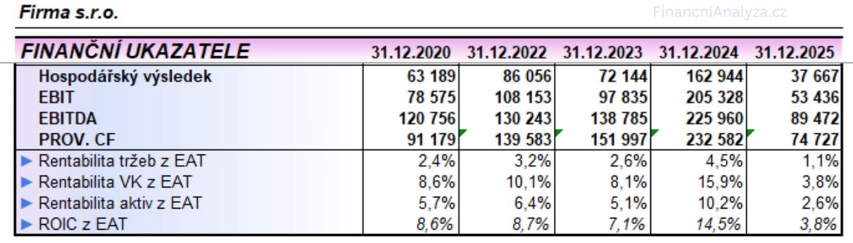 Pozn.: Spodní tabulka pak ukazuje použití výsledku hospodaření (EAT) pro výpočet ukazatelů ziskovosti. Pokud nicméně použijeme upravený výsledek hospodaření, tzv. provozní CASH FLOW, bude u této firmy ziskovost přesnější, v našem případě výrazně vyšší.