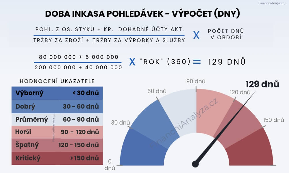 - Pokud vychází ukazatel doby obratu pohledávek 40 dnů, tak firma průměrně, od okamžiku, kdy vystaví odběratelům fakturu, obdrží zaplaceno za 40 dnů. Pokud pohledávky, které odběratelé hradí za 40 dnů činí v bilanci firmy 20 mil, tak pokud by odběratelé začali platit v průměru až za 80 dnů, tak by firmě vzrostly tyto pohledávky na 40 mi.